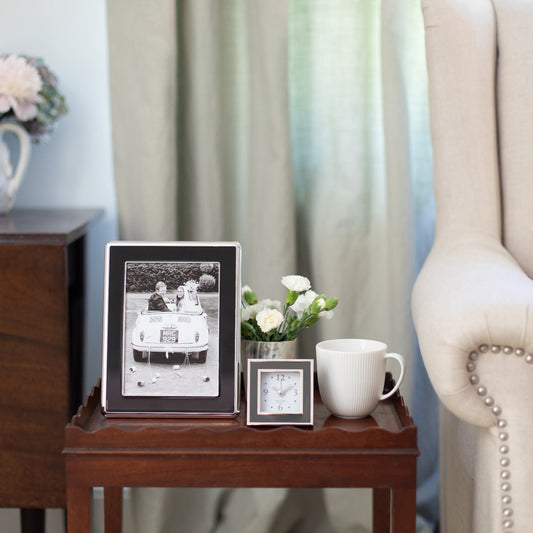 Inlaid with rich enamels, faux leathers and wood veneers, these richly finished alarm clocks complement our many frame designs. Finished in silver or gold coloured plating. Packaged in our beautiful branded gift boxes.